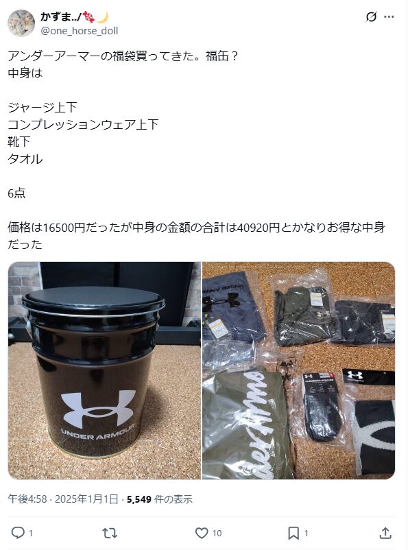 UNDER ARMOUR(アンダーアーマー)の福袋は、「16,500円で40,000円相当」との口コミもあるほど、神コスパです。